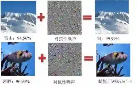 如图 1 所示(左图为原始样本,中间为添加的对抗扰动,右图为构造的对抗样本),可以看出在加入对抗扰动后原始的图片被误判(雪山变识别成了狗,河豚被识别成了螃蟹),但是人眼并不能够明显发现原图和对抗样本的差异,更不会产生如此离谱的判断。