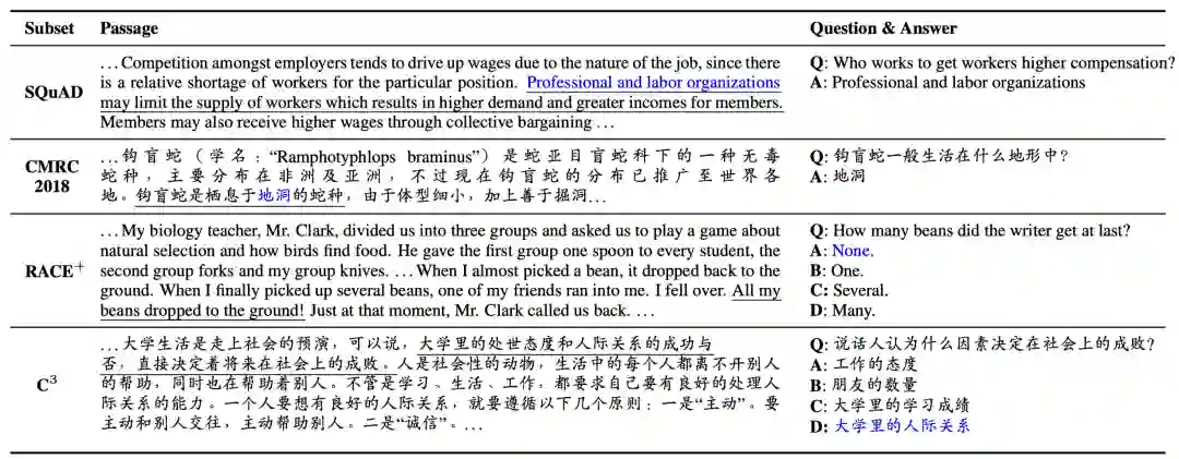 C3:同样是选择型阅读理解数据集(中文)。需要注意的是,这里我们只使用了非对话型子集C3(M)。