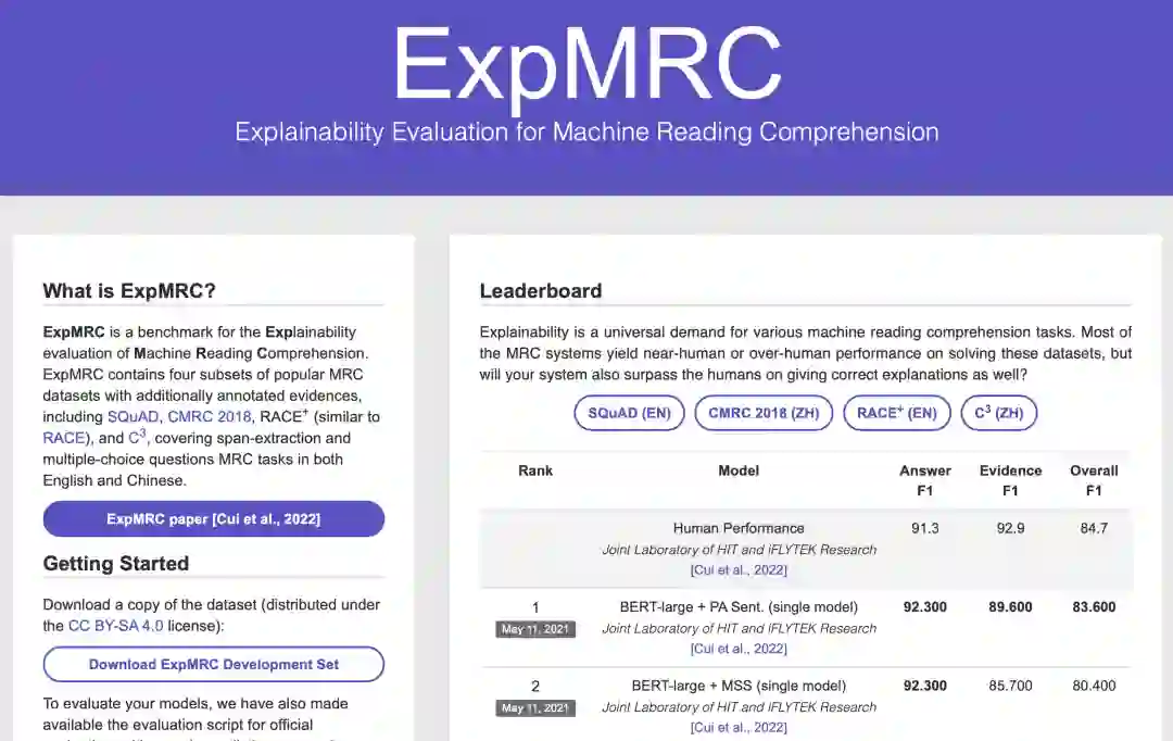 Yiming Cui, Ting Liu, Wanxiang Che, Zhigang Chen, Shijin Wang. ExpMRC: Explainability Evaluation for Machine Reading Comprehension[J]. 2022. Heliyon 8, e09290. Cell Press. doi: 10.1016/j.heliyon.2022.e09290