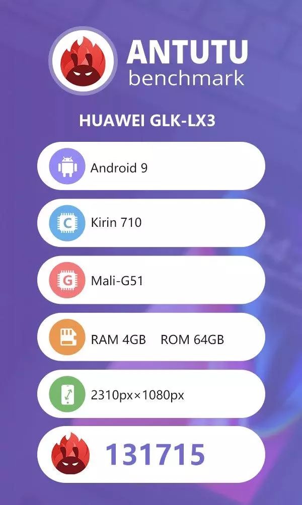 核心配置上,该机采用2310×1080显示屏(暂不确定其屏幕形态),搭载麒麟710八核处理器,配备4GB内存+64GB存储,摄像头信息暂时未能识别,运行Android9系统,安兔兔跑分为131715。