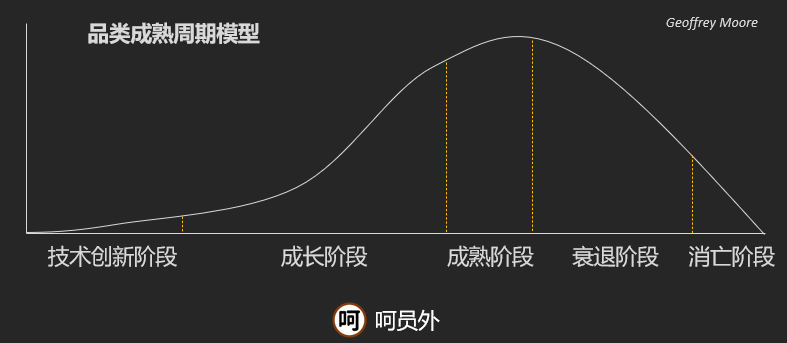 根据杰弗里·摩尔(Geoffrey Moore) 提出的品类成熟周期模型,一个品类会从技术创新阶段开始,经历市场成长阶段、市场成熟阶段、市场衰退阶段到最后市场消亡阶段。