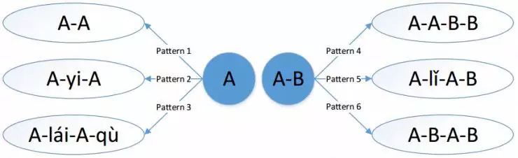在词法关系方面,作者主要研究了两个内容,一是重叠(Reduplication),二是半词缀(Semi-affixation)。所谓重叠就是词语中的部分汉字以一定的形式发生重叠,从而引起语法或语义差异,作者总结出六种重叠模式,如下图所示。