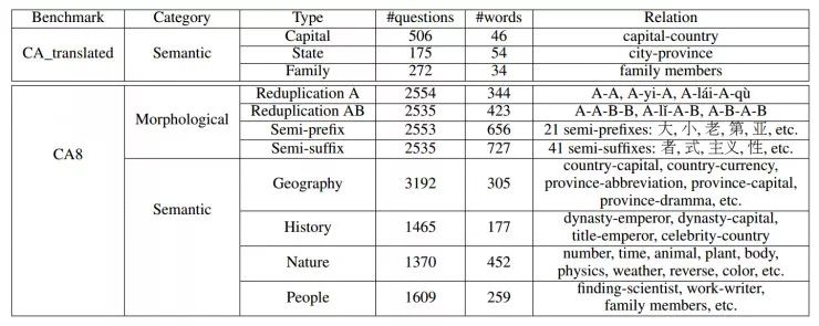为了满足汉语类比推理任务的要求,作者团队自建了 CA8 数据集(共17813 个问题),包含大量的类比问题,对语法和语义都有涉及。CA8 相较于之前翻译自英文数据集的 CA_translated 有很大改进。如下图所示。