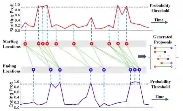 要生成候选时序动作提名,首先我们选择动作开始和动作结束概率序列中满足以下两个条件之一的时间节点作为候选时序边界节点:(1)概率高于一个阈值 或(2)该时间节点的概率高于前一时刻以及后一时刻的概率。然后我们将候选开始时间节点和候选结束时间节点两两结合,保留时长符合要求的开始节点-结束节点组合作为候选时序动作提名。算法示意图如下图所示。