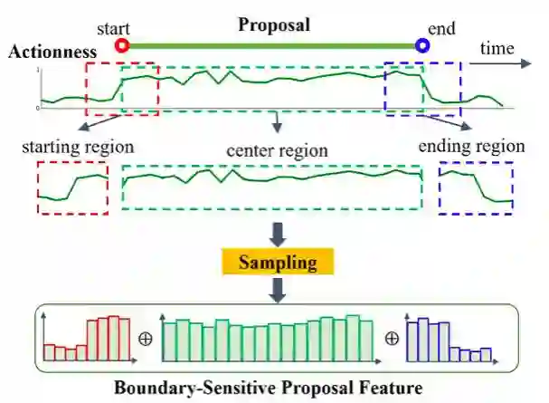 接下来要为每个候选时序动作提名生成对应的特征描述,我们称其为Boundary-Sensitive Proposal (BSP) feature。对于每个提名,我们取其本身的时序区间作为center region,再取开始节点和结束节点附近的一段区间作为starting region 以及 ending region。对于每个区域,我们都在动作概率序列上的对应位置采样N个点,拼接后则得到一个非常简短的提名特征。BSP特征的构成示意图如下图所示。