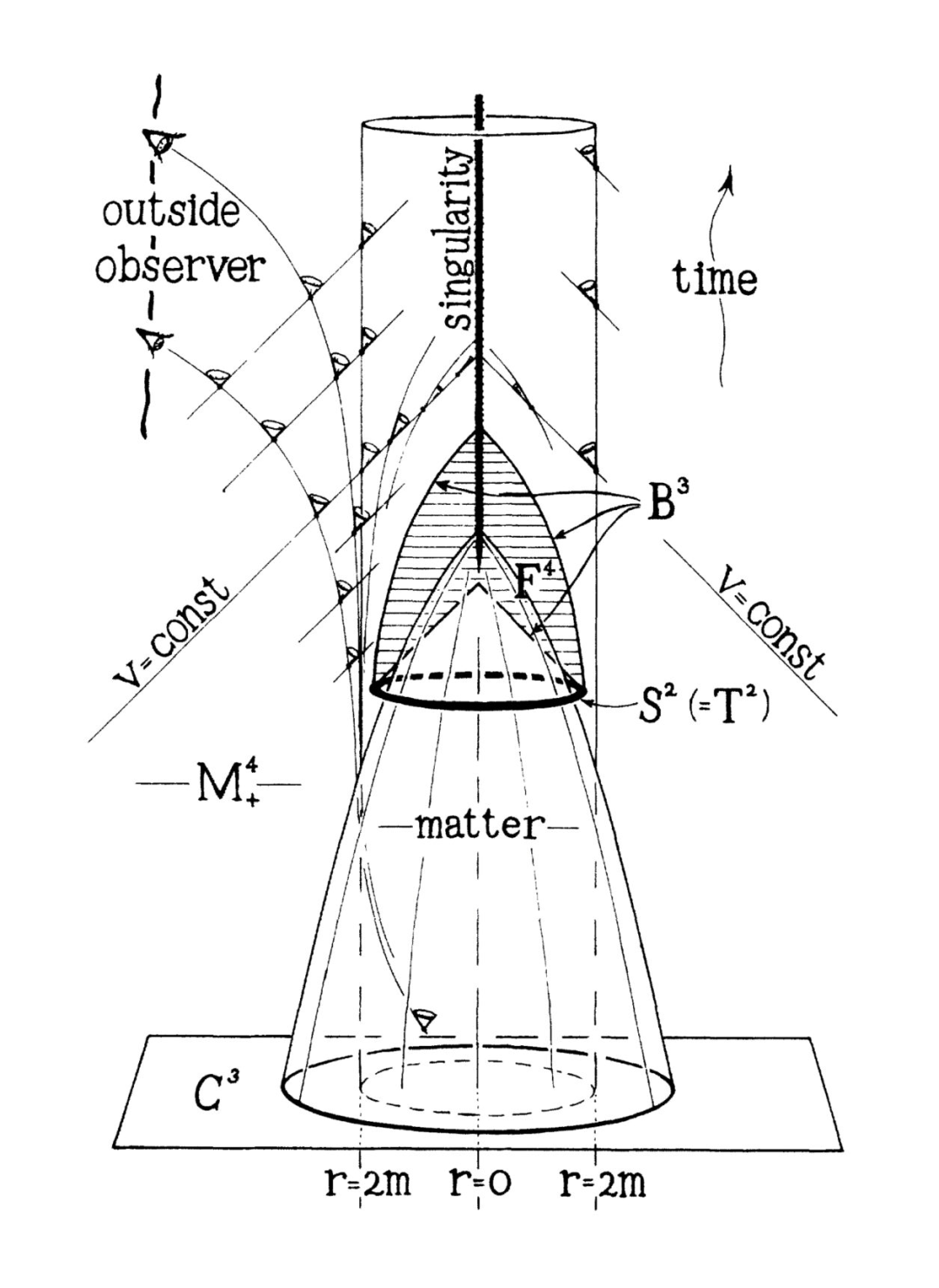 他通过引入「陷阱表面」的概念,以及现在著名的分析表面在时空中如何位置的图解方案来说明这一点。与普通表面不同的是,被困表面是一个封闭的二维表面,即使扭曲变形,它也不再是一个球体,只允许光线向一个方向: 朝向中心点。