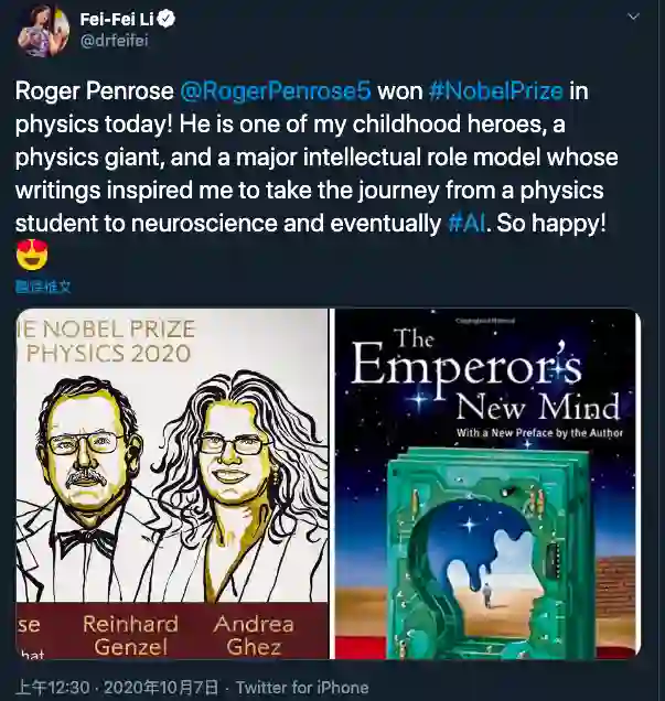 李飞飞发推祝贺童年偶像获诺奖,彭罗斯:人类意识是非算法的