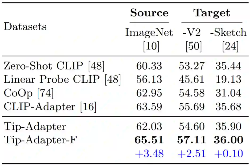 我们也测试了 Tip-Adapter 和 Tip-Adapter-F 在领域泛化(Domain Generalization)方面的表现。如表 6 所示,我们的两种方案都表现出了很强的鲁棒性以及特征迁移能力。