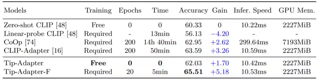 基于 Tip-Adapter 的网络结构,我们可以进一步将 Cache Model 中的 Keys 部分变为学习参数,即可以通过训练来进行更新,该方案为 Tip-Adapter-F。借助已经构建好的 Cache Model,Tip-Adapter-F 仅需要现有 CLIP-Adapter 十分之一的训练回合数和时间,就可以实现更高的性能,如表一所示。