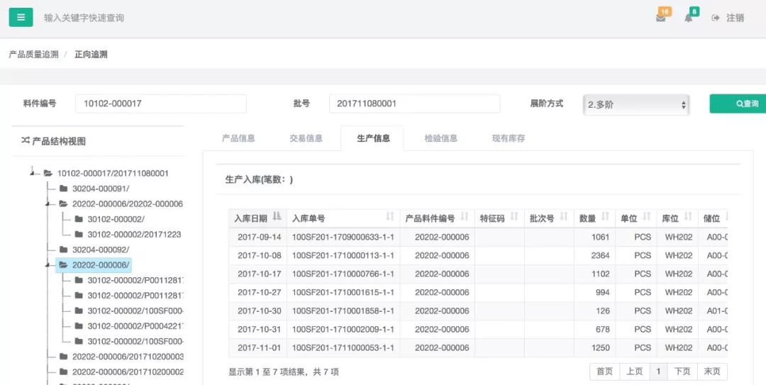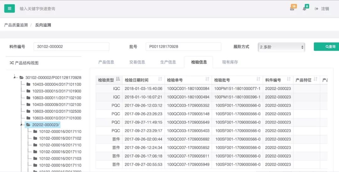 依产品所用部件或原料及批次号自下而上追溯,追溯所有用到此批次部件或原料的产品及批次、涉及到的各料件批次号的基本信息、生产过程、库存交易出入库、检验信息、现有库存信息等。