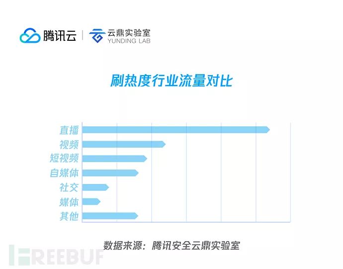 展开占比最大的「刷热度」部分数据,可以看到,由于近两年直播、短视频相关 APP 的高速发展,包括传统的视频播放类网站,视频类刷热度直接占据了相关数据欺诈领域的 TOP 3。排在之后的是相对传统的如公众号、微博等领域。