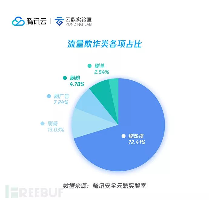 云鼎实验室上半年恶意流量监测数据显示,在流量欺诈方面,刷热度占据最大的比例,超过七成;基于 AppStore 和各个手机厂商 Android 软件市场的刷榜占据第二;其次是对网络广告的假点击方面,由于国内 CPC(点击付费)类广告相对较少,这块主要集中在海外。