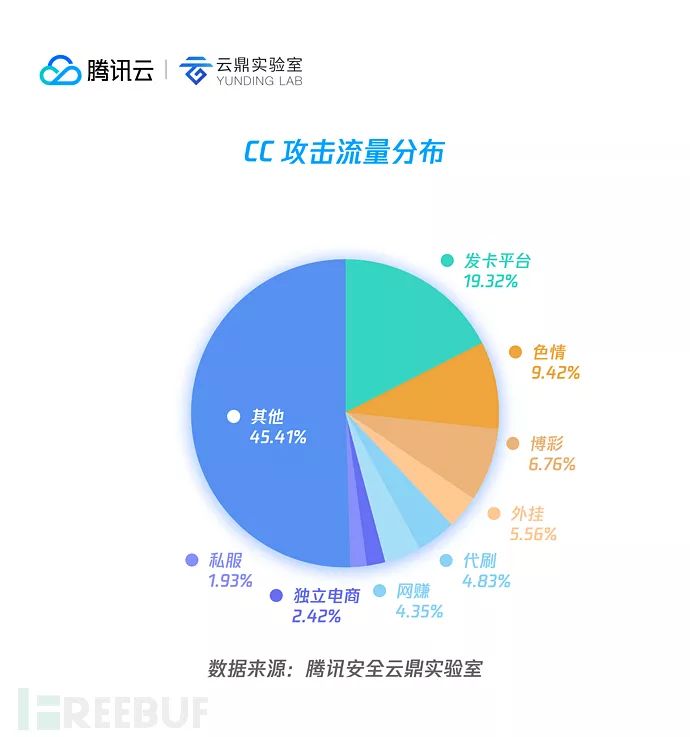 源于黑灰产的暴利,黑灰产间互相攻击一直是恶意攻击的很大一部分,除了使用 DDoS 攻击外,CC 攻击由于简单实用,也是黑灰产间互相攻击的主要方式之一。上图可见,超过一半的 CC 攻击流量都是黑灰产之间互相攻击,剩下的也部分由于网站直接打挂了或转移了无法统计。