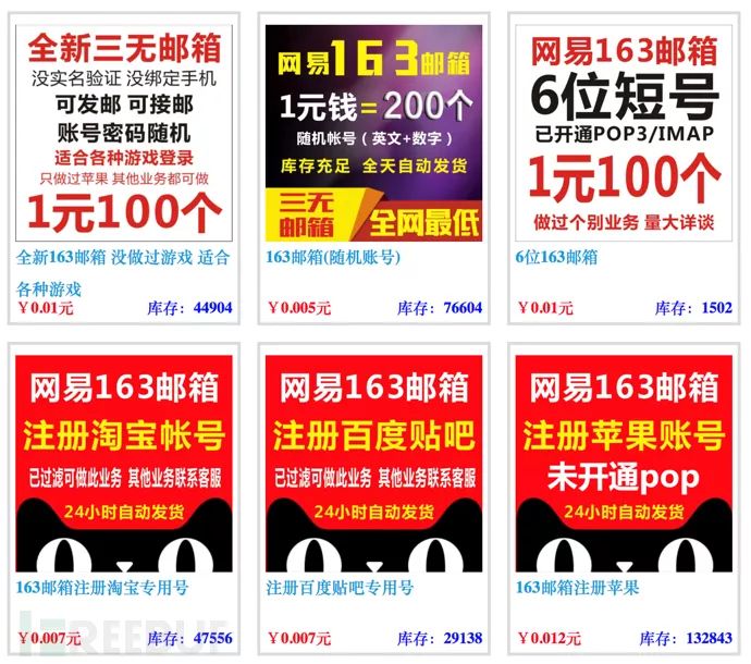 如下图为例,是某邮箱注册商的自动销售页面,可以精准购买用于注册不同网站帐号的邮箱(由于一个邮箱可以注册多个网站,故可针对不同网站重复售卖)。