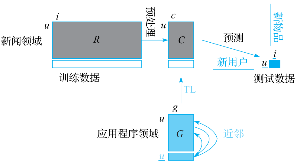 可以从迁移学习的角度来解决双冷启动推荐问题。尽管在新闻领域中没有关于冷启动用户和冷启动物品的用户行为,但也可能存在其他相关领域的用户行为。具体来说,我们利用了相关领域 ( 即应用程序 (
