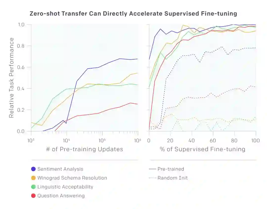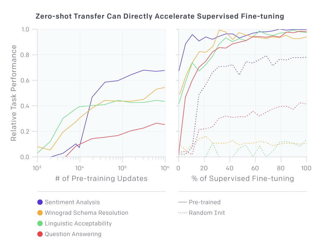 在此之前我们曾发布了一篇有关“情感神经元”的研究,其中我们注意到无监督学习技术能产生非常明显的特定。这里,我们想将这一技术进一步拓展:是否能创建一个模型,将其在大量数据上进行无监督训练,之后再在多种不同任务上进行微调?结果证明,这一方法非常有效。模型只需要微小调整就能适应多种任务。