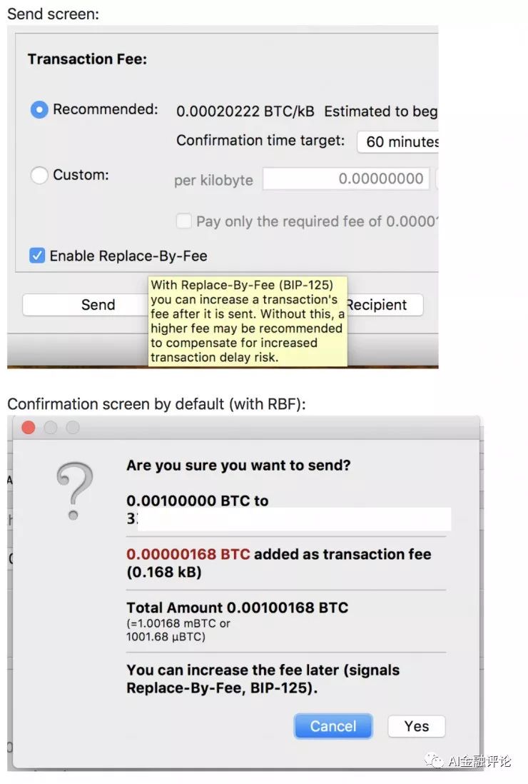 Bitcoin core 0.16.0首次将替代费用设置为默认发送选项。在交易中用户仍然可以选择不添加替代费用标签,只要勾选一个选项就好。但是只要他们不勾选,交易费用就可以替换。这会防止用户在不知情的情况下失去了选择权,也许他们本来可以轻易地快速完成交易,却直到为时已晚才注意到。
