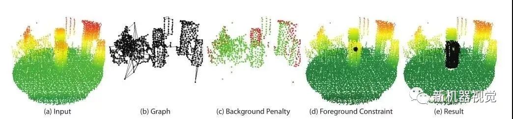如果要分开最左边的点和最右边的点,红绿两种割法都是可行的,但是红线跨过了三条线,绿线只跨过了两条。单从跨线数量上来论可以得出绿线这种切割方法更优的结论。但假设线上有不同的权值,那么最优切割则和权值有关了。点云是一种非常适合分割的对象,点云有天然分开的点,可以用点与点之间的欧式距离来构造权值,所有线的权值可映射为线长的函数。2009 ICCV 的一篇论文提出了基于最小割的点云分割算法,给定一个对象位置,构建一个k-最近邻图,选择一个前景点作为硬约束,通过计算最小割来找到前景-背景的最佳分割。