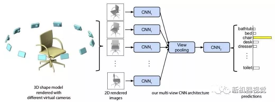 但是体素网格可能会带来巨大的数据量以及量化误差的代价,因此又出现了基于多视图数据以及基于点的表示方法。Massachusetts大学的ICCV2015即使用了基于多视图的卷积神经网络,该方法从不同的视角“拍摄”得到该物体的不同视角下的图像,将这些产生的二维图像作为训练数据。中间会有个“View Pooling”,接着会进行第二部分的卷积。