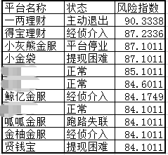 金智塔上月对杭州197家平台数据进行了风险预警整理,全杭州风险指数榜单中前11家有8家异常,其中就包括了最近刚雷的“一两理财”“得宝理财”等平台。