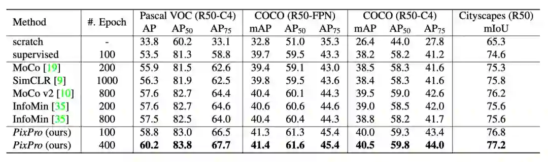 表4:PixPro 结合下游任务网络以及实例级别对比学习结果