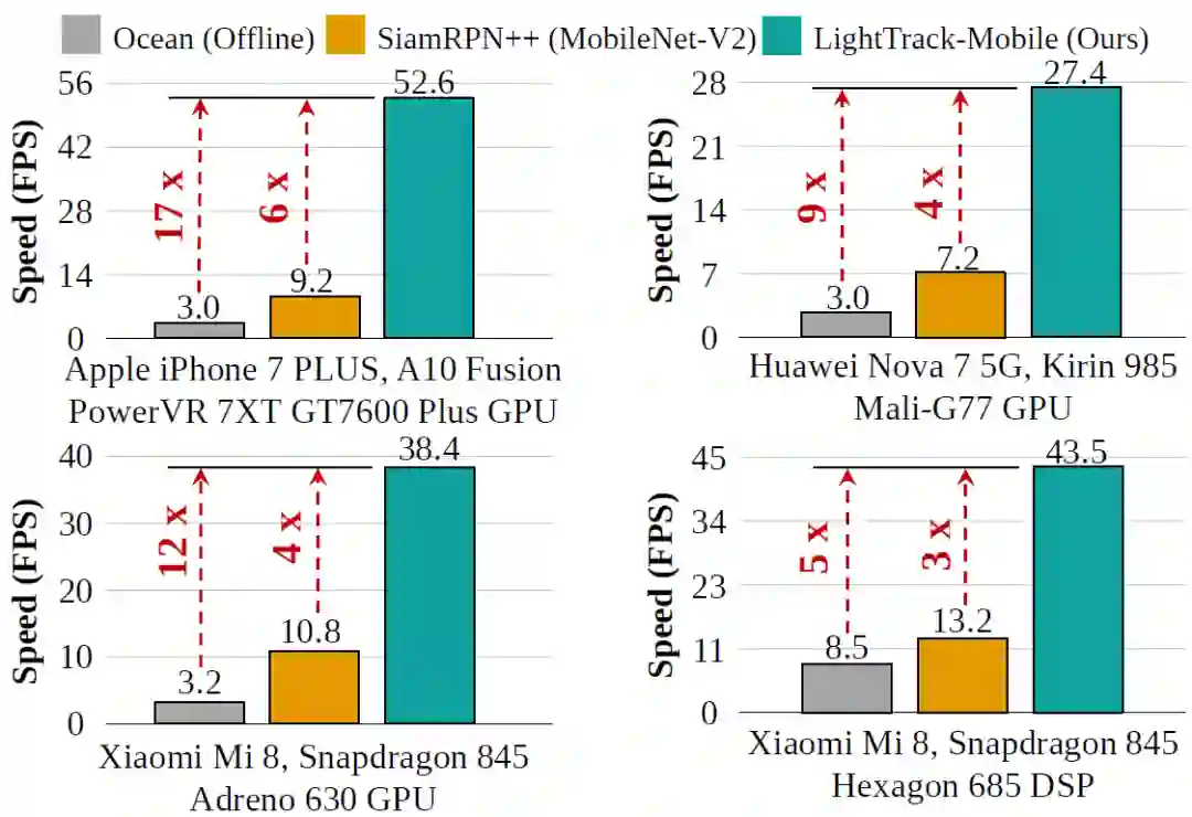 研究员们还在多种资源有限的硬件平台上比较了 LightTrack 和其他性能先进的方法的运行速度,如图6所示,LightTrack 的速度要比 Ocean 快5倍到17倍。