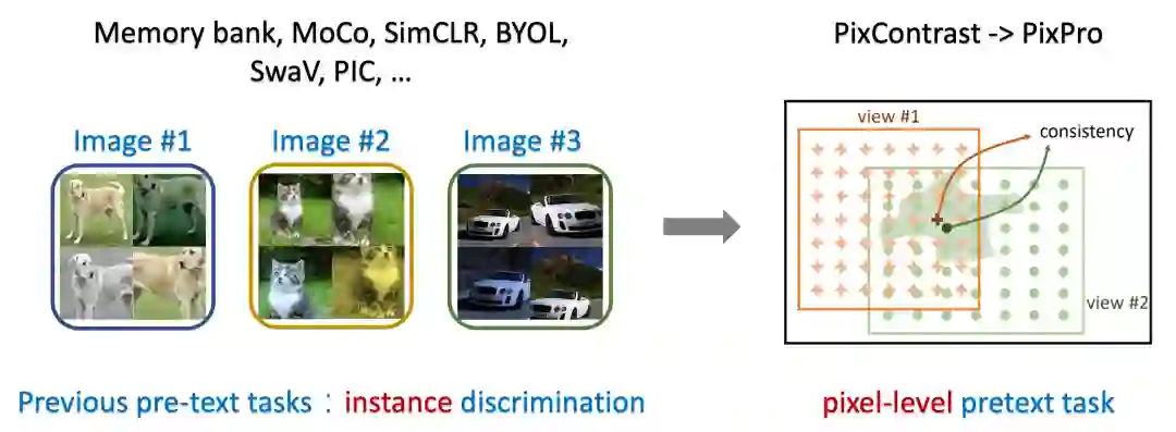 为此,PixContrast 把实例级别对比学习任务推广到了像素级别,PixPro 则进一步引入了空间平滑性,通过设计像素到传播一致性任务来大幅提升自监督预训练模型的迁移性能。
