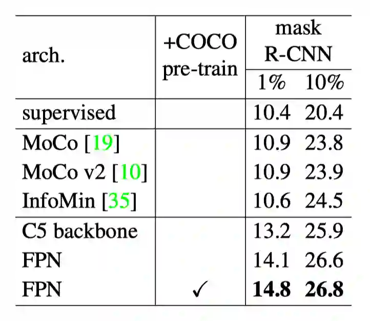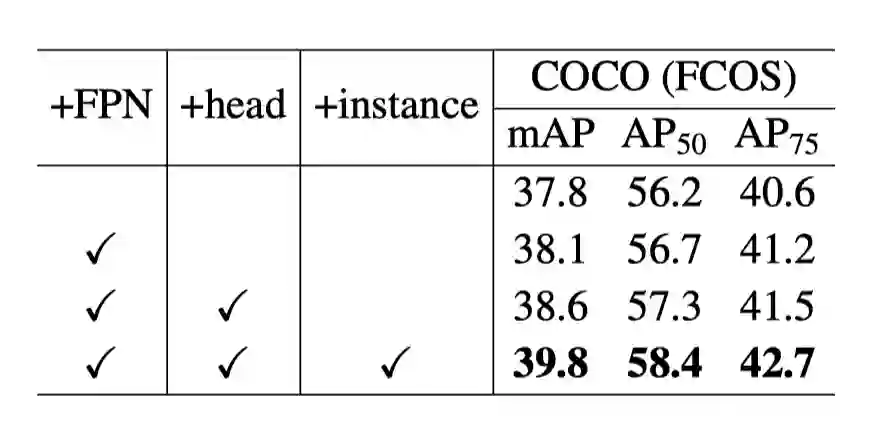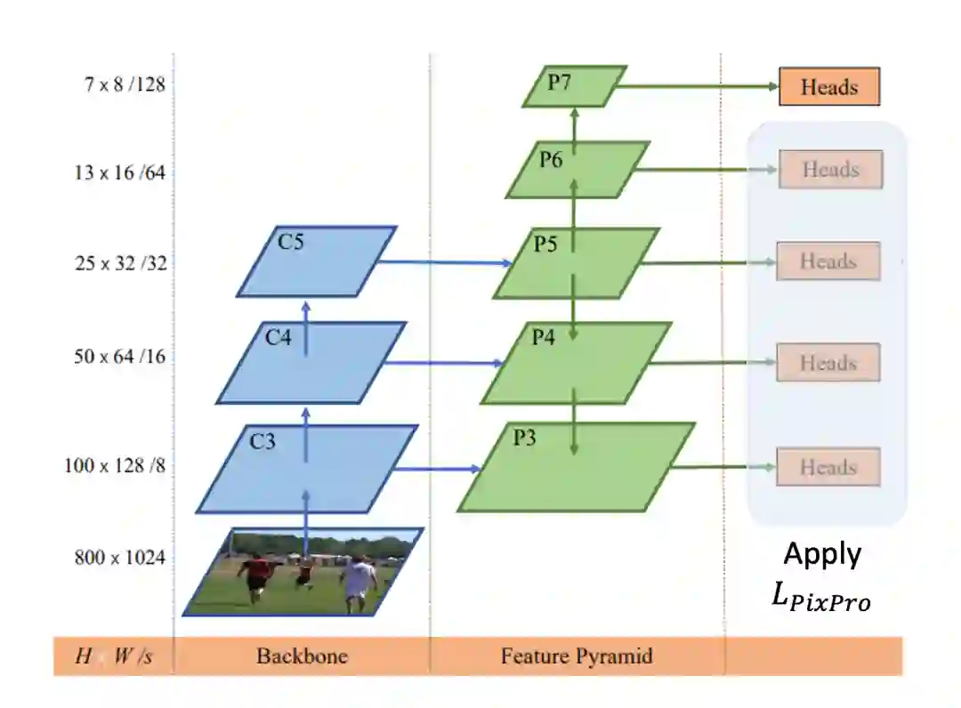 图13:将带有 FPN 结构的 FCOS 与 PixPro 相结合,让 PixPro 有利于实现与下游检测任务更一致的自监督预训练