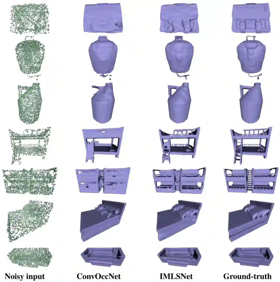 图2:在未知类别物体上的结果比较。在这些训练集合以外的物体类别上,IMLSNet 的结果质量高于对比方法,展示了良好的泛化能力。