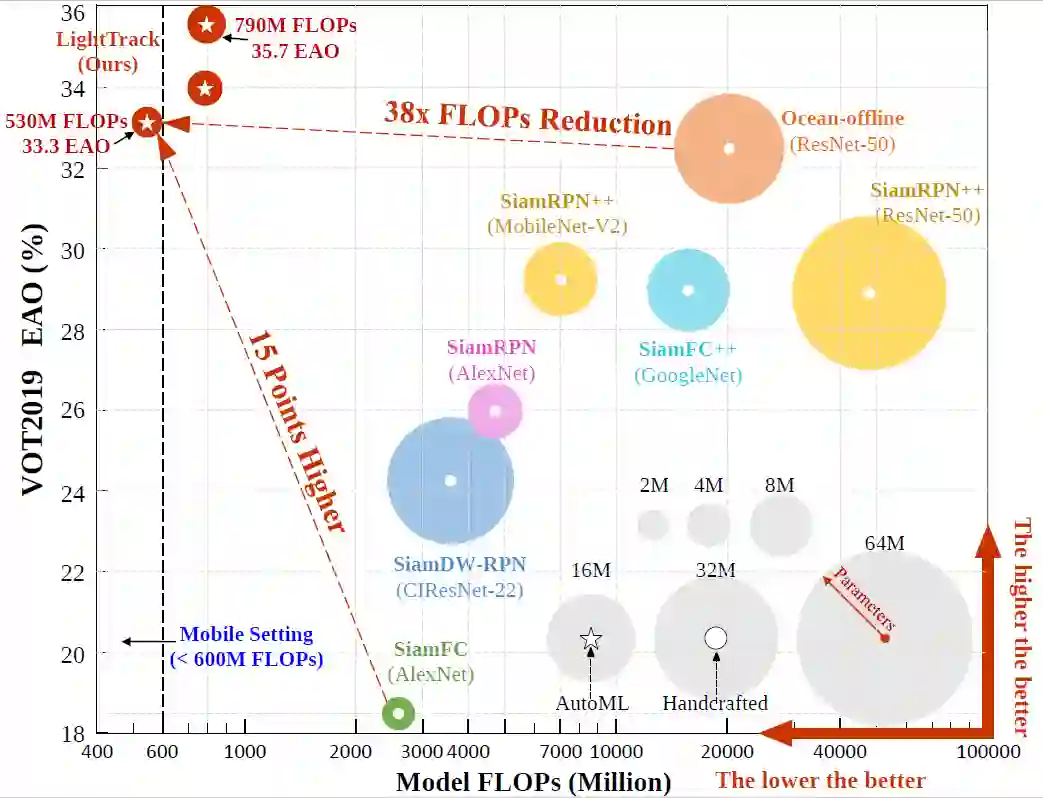 图5:VOT 2019 数据集上的精度、计算量、参数量综合比较