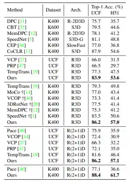研究员们将预训练过的视频表征模型迁移到一系列下游任务中,如动作识别、视频检索等等,该方法都取得了非常不错的性能。例如,在 UCF-101 动作识别数据集上,随机初始化的模型仅有67.0%的准确率,而预训练过的 R(2+1)D 模型能够达到88.4%的准确率,这与有监督学习的结果92.7%已经较为接近。在未来的工作中,研究员们希望进一步探索视频帧间运动信息在自监督学习中的应用。