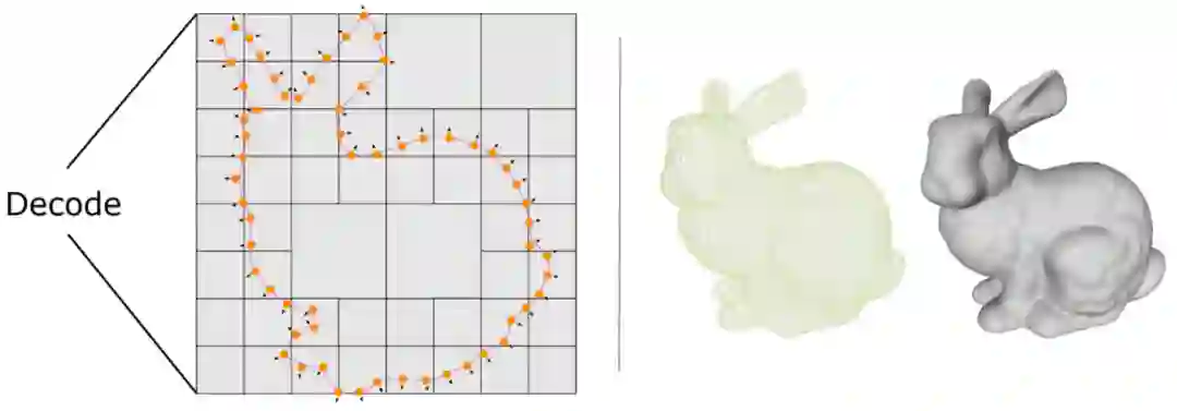 三维重建是计算机视觉和深度学习的重要任务。到目前为止,三维重建按照其表达方式仍然主要分为两大类:一类是显式表达,以点云为代表(也有生成网格和体素),由神经网络直接回归生成三维空间中的几何元素;另一类是隐式表达(如 OccNet, NeRF),神经网络只是建模三维物体的空间占用,需要后续的渲染或表面提取获得显式三维形状。两类方法各有优缺点:点云灵活直观、生成方便,但是无法表达高质量的几何形状;隐函数可以捕捉丰富的细节,但是隐式到显式的转换计算代价高昂。