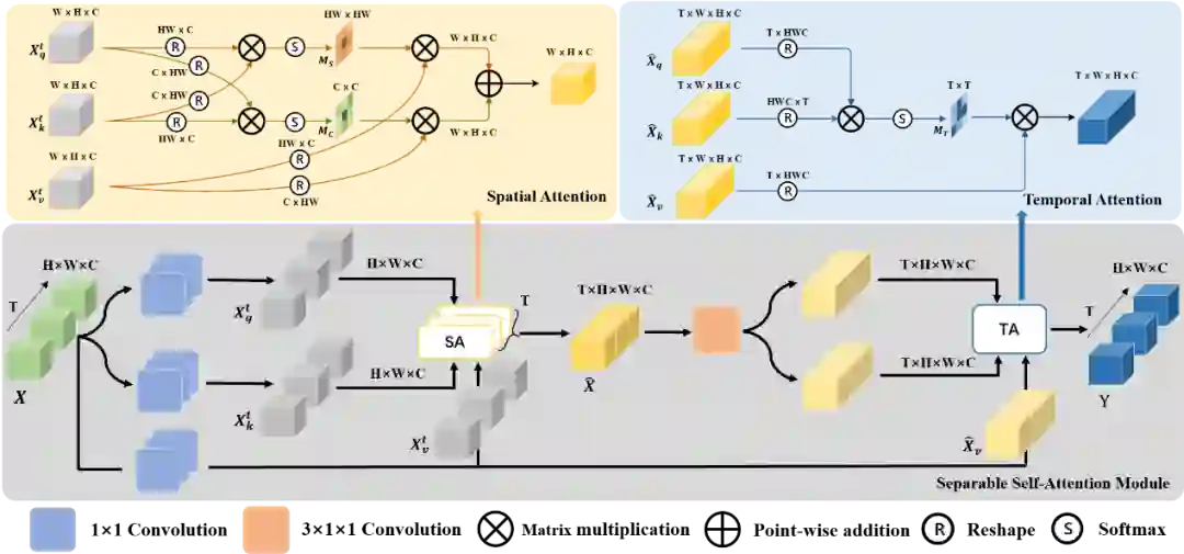 图16:可分离自注意力模块。黄色代表空域注意力(SA),蓝色代表时域注意力(TA)