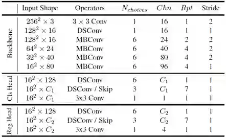 而为了减小模型的计算量和参数量,LightTrack 的骨干网络和预测头部分别采用了“逆向残差单元”(Inverted Residual Blocks)和“深度可分离卷积” (Depth-wise Separable Convolutions)作为核心模块。对于逆向残差单元,设置其卷积核大小有{3, 5, 7}三种选择,通道倍增率有{4, 6}两种选择;而对于深度可分离卷积,设置其卷积核大小有{3, 5}两种选择,通道数有{128, 192, 256}三种选择。与此同时,研究员们还通过加入短路连接(shortcut connection)允许预测头部具有可变的深度。除此之外,关于“骨干网络产生的多层特征中,哪一层最适合目标跟踪任务”这一问题,目前尚未有明确结论。在论文中,研究员们也将所要选取的层作为了一个可搜索的变量,进一步增加了超网结构的多样性。