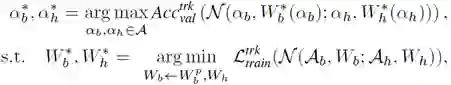 目前,主流的目标跟踪模型由两部分构成:基于 ImageNet 预训练的、用于特征提取的骨干网络,和用于目标定位的预测头部。这两部分共同决定了跟踪器的性能,因此研究员们将它们看作一个整体,在目标跟踪数据集上联合搜索最适合跟踪任务的“骨干网络-预测头部”结构。此外,由于骨干网络需要在 ImageNet 上进行预训练,而对所有可能的骨干网络结构分别独立做 ImageNet 预训练在计算量上是无法承受的,所以研究员们将所有可能的结构统一为一个超网,全部子网络共享超网参数,并通过对超网进行预训练来达到对所有子结构做预训练的效果。搜索过程可以用以下公式描述: