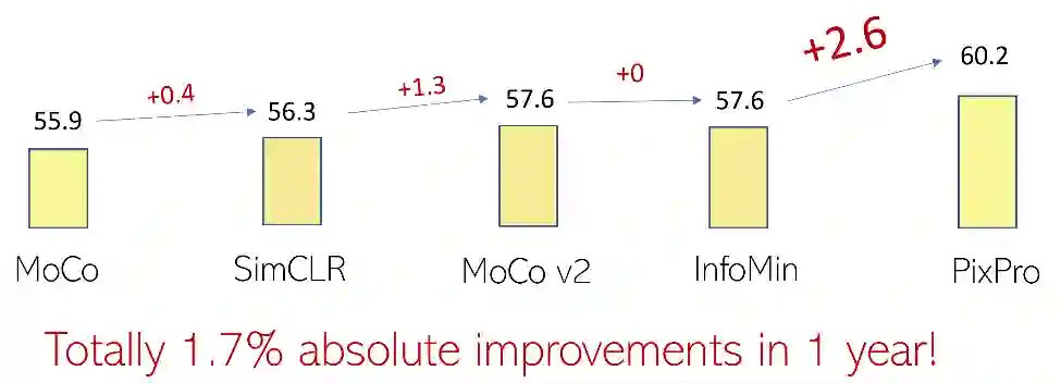 图9:MoCo 后一年内自监督预训练方法在 Pascal VOC 物体检测任务上提升了1.7个点,PixPro 一次带来额外2.6个点的提升