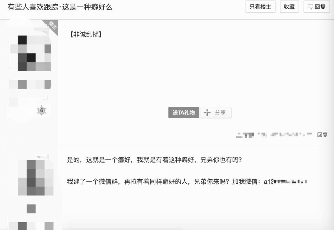同时我还发现他建立了一个交流群,你没听错,群里集聚了和他一样有跟踪癖好的人。