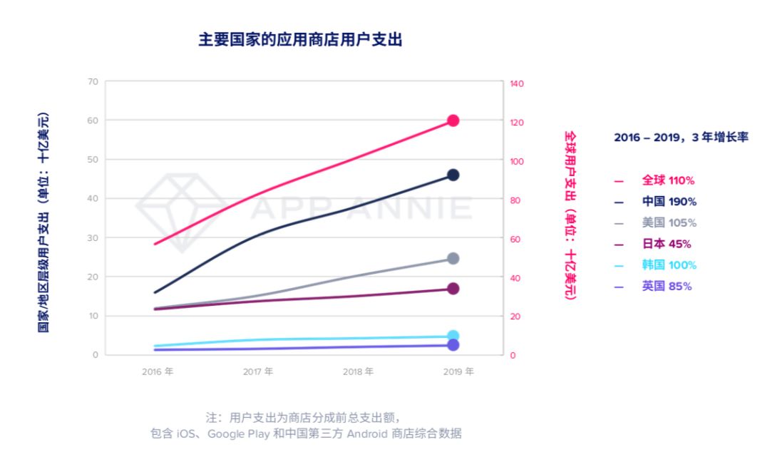 无论是美国、日本、韩国等成熟市场,还是印度、巴西、印度尼西亚等新兴市场,消费者对App下载的热情都超出想象,应用商店支出已达到了1200亿美元,是2016年的2.1倍。