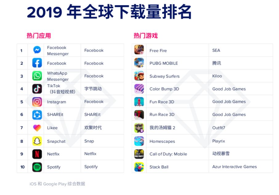 从2019年全球下载量排名榜单可见,来自字节跳动的Tik Tok(抖音短视频)在热门应用中排名第四,仅次于霸占前三的Facebook社交全家桶。