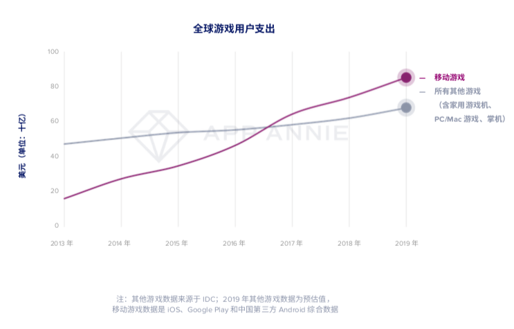手游玩家的氪金热情不断高涨,2019年移动游戏用户支出是其他平台总和的1.25倍,预计2020 年全球移动游戏用户支出将突破 1000 亿美元。