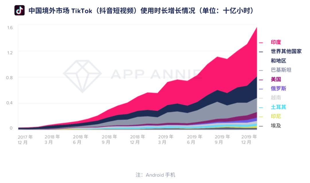 2019年,中国用户使用Tik Tok时长就占据了总体的80%,但Tik Tok已成功出海,在印度、巴基斯坦、印度尼西亚等新兴市场使用量也大幅攀升。其同比增长下载量在加拿大、印度高居榜首,在美国和英国也位居第二,海外突围已初显成效。
