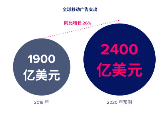 如此巨大的注意力资源,与移动应用无与伦比的可访问性和覆盖范围也使得移动广告备受广告主青睐,仅2019年就创造了1900亿美元成绩,根据预测2020年全球移动广告支出将达2400亿美元,比2019年增加26%,成为移动领域最辉煌的一年。