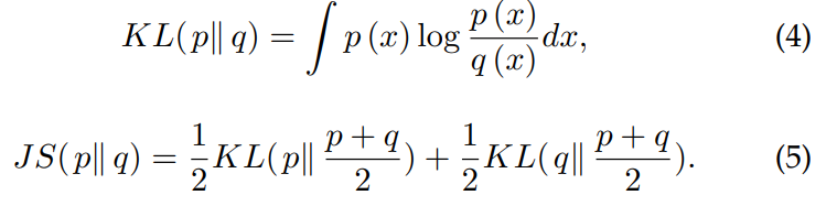 两个概率分布 p(x) 和 q(x) 之间的 KL 散度和 JS 散度定义如下:
