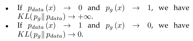 从 (12) 式可以看出,对非饱和博弈中的替代 G 损失函数的优化是矛盾的,因为第一项目标是使生成的分布与实际分布之间的差异尽可能小,而由于负号的存在,第二项目标是使得这两个分布之间的差异尽可能大。这将为训练 G 带来不稳定的数值梯度。此外,KL 散度是非对称度量,这可以从以下两个例子中反映出来