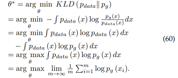 并不是所有生成模型都使用 MLE。一些生成模型不使用 MLE,但可以被修改为使用 MLE(GAN 就属于此类)。可以简单地证明,最小化 p_data(x) 和 p_g(x) 之间的 KL 散度(KLD)等价于最大化样本数 m 增加时的对数似然: