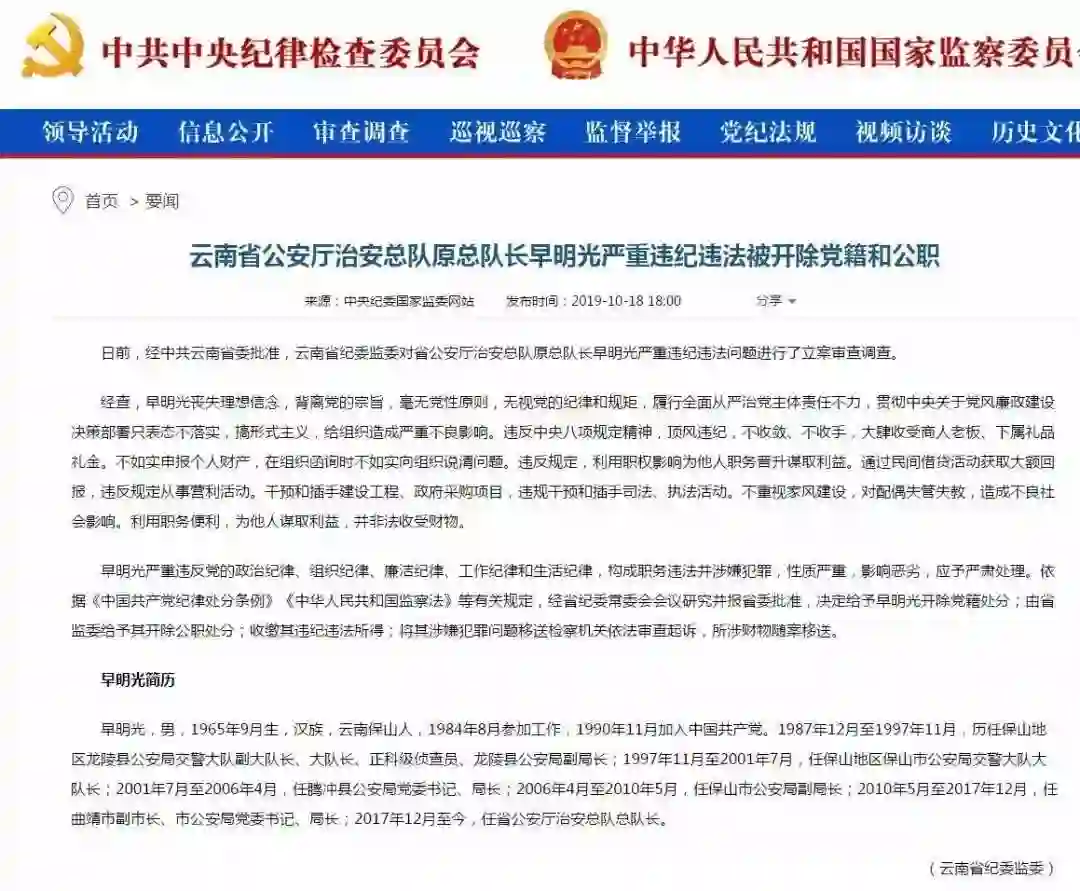 据中央纪委国家监委网站消息,日前,经中共云南省委批准,云南省纪委监委对省公安厅治安总队原总队长早明光严重违纪违法问题进行了立案审查调查。