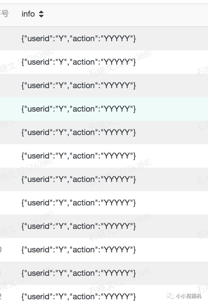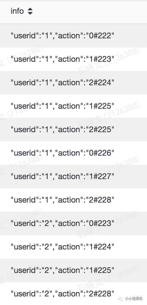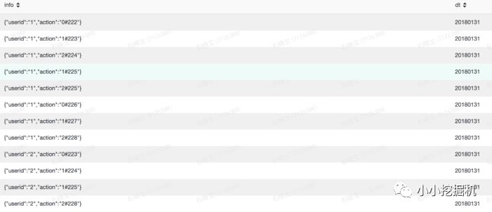 为了模拟我们的hive函数,我们特地将info字段写成了一个json格式,info中有两个键值对,一个是user_id,另一个是用户的行为,行为中有两个数据,用#隔开,分别是动作的类型和动作发生的时间。我们可以这样认为,0代表百度首页,1代表进行了一次搜索的搜索结果页,2代表查看搜索结果中国年的某个详情页。从一次动作0 到 下一次动作0,我们可以认为这是用户和百度一次完整的交互,即一次session,从一次动作1到下一次动作1,可以认为是一次完整的搜索操作。另一个字段是dt,即我们的分区字段。