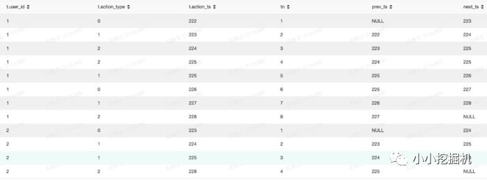 比如,我们用lag和lead分别记录用户上一次行为和下一次行为的发生时间,语句如下: