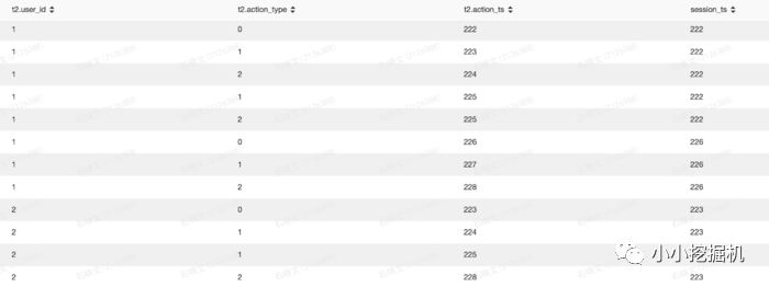 我们来一步步剖析一下该过程的实现,首先,我们在子查询中实现了两个表的内链接。第一个子查询查询出所有session开始的action_ts以及它对应的下一个session开始的action_ts,使用lead实现: