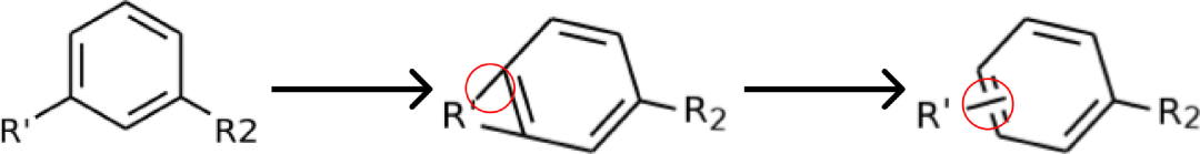 如果环的取代基不超过两个,则 R 基团(R、R1、R2、R'、R'')以 20% 的概率绘制在可变位置,但该算法对一个环进行一次替换,一个分子最多替换两个。添加了一个虚拟键,使 RDKit 将基团放在环键的前面,然后使用 SVG 后处理将两个键替换为单行。下面的例子给出了直观的解释。